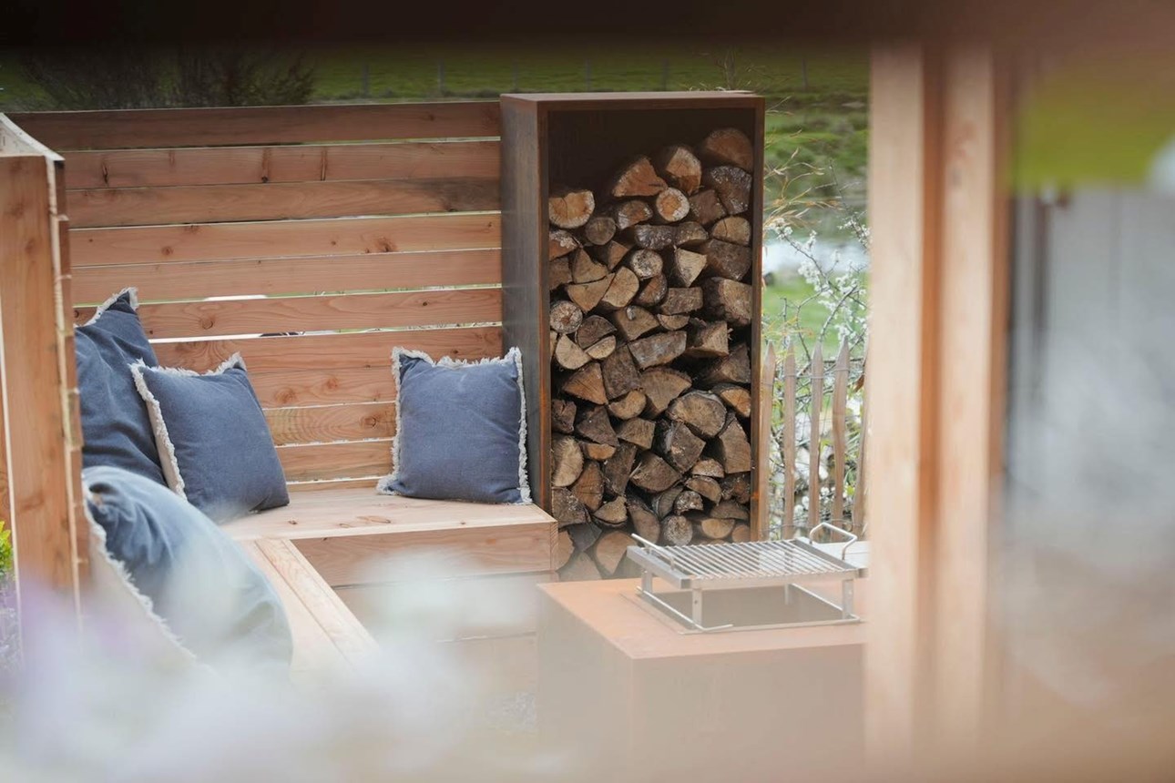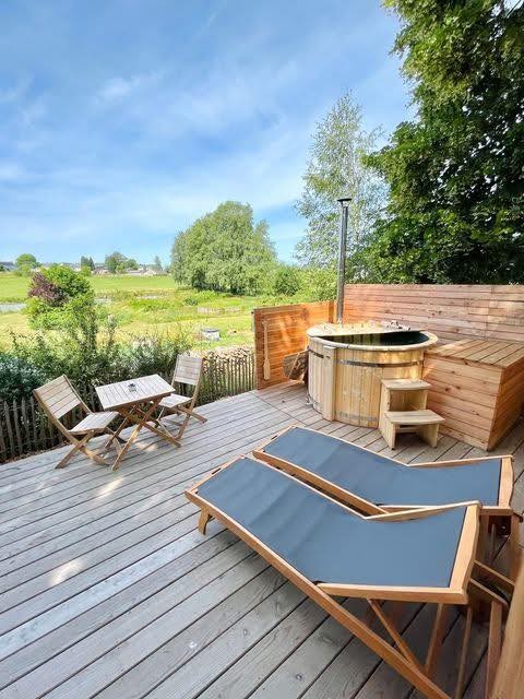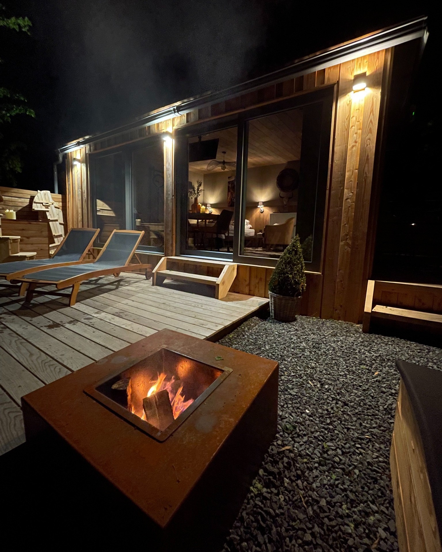 À l’extérieur, un bain nordique chauffé au feu de bois vous attend. La chaleur de l’eau, le parfum du bois qui brûle lentement et le silence du jardin créent une sensation unique : celle d’être coupé du monde, tout en étant profondément ancré dans la nature. C’est le cœur de l’expérience, un instant suspendu que l’on savoure jusqu’à la tombée de la nuit.