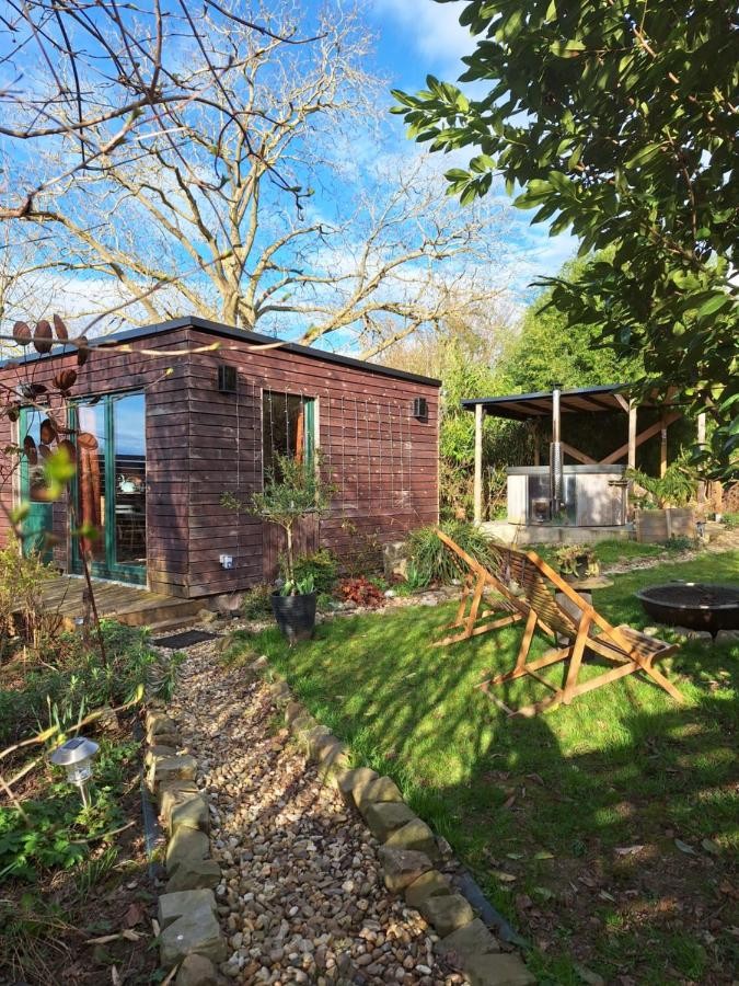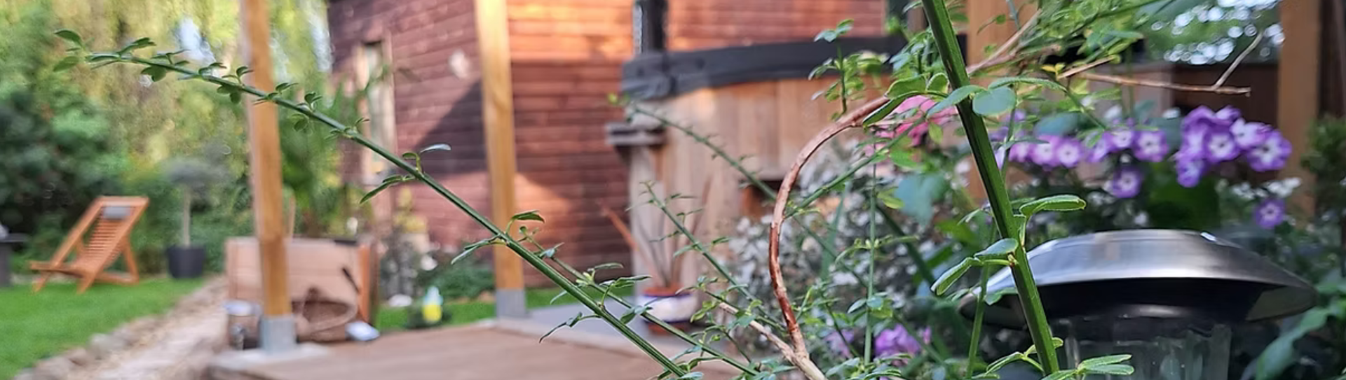 Le jacuzzi chauffé au bois est accessible toute l’année. La chaleur de l’eau, le crépitement du feu et le silence du jardin composent un havre de détente unique, propice aux conversations qui se prolongent et aux moments complices. À la tombée du soir, le brasero prend le relais pour une fin de journée douce, un verre à la main, sous un ciel dégagé.