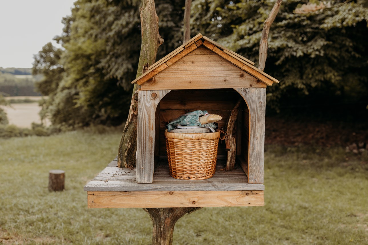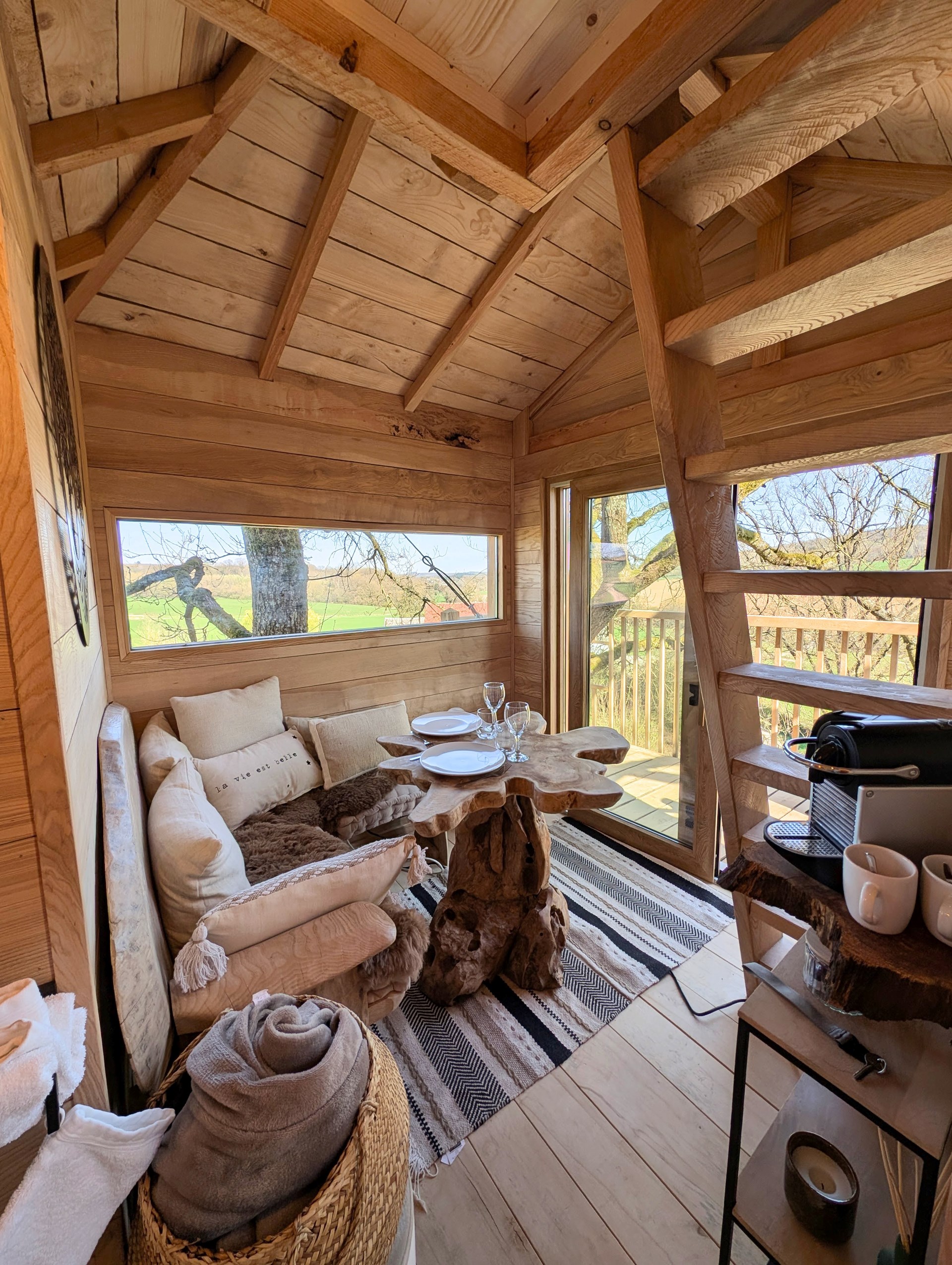 Perchée au cœur de la Ferme de Basseilles, cette cabane offre une parenthèse douce et intime où la nature se vit différemment, plus près, plus fort, presque à hauteur des arbres. Posée en lisière de forêt, elle invite à un ralentissement naturel, portée par la lumière qui entre à travers les fenêtres et par le paysage qui s’étend autour d’elle, silencieux et enveloppant.