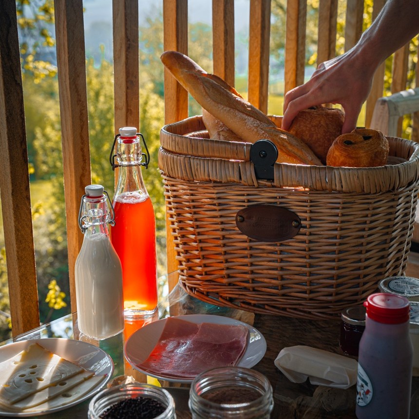 Au réveil, un petit déjeuner préparé avec soin est livré à la cabane. Un début de journée tranquille, accompagné du chant des oiseaux et de la lumière qui traverse les arbres, avant de poursuivre la découverte.