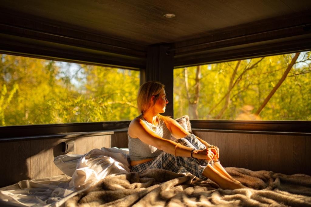 Avec son mari, Valérie Goosse a conçu le Wild Cube de A à Z, en imaginant chaque espace, chaque meuble, chaque détail. Ici, le lieu a été pensé dans le respect total de la nature : le cube a été posé en évitant de couper les arbres, le bain nordique ne se remplit que si vous choisissez de l’utiliser et se chauffe au feu de bois, dans une logique de sobriété et de cohérence. Ce logement quasi zéro énergie incarne une vision du voyage plus consciente et plus ancrée. Discrets mais profondément attentifs, Valérie et son mari accueillent leurs hôtes avec soin, mettant un point d’honneur à valoriser leur région et les producteurs locaux qui la font vivre.