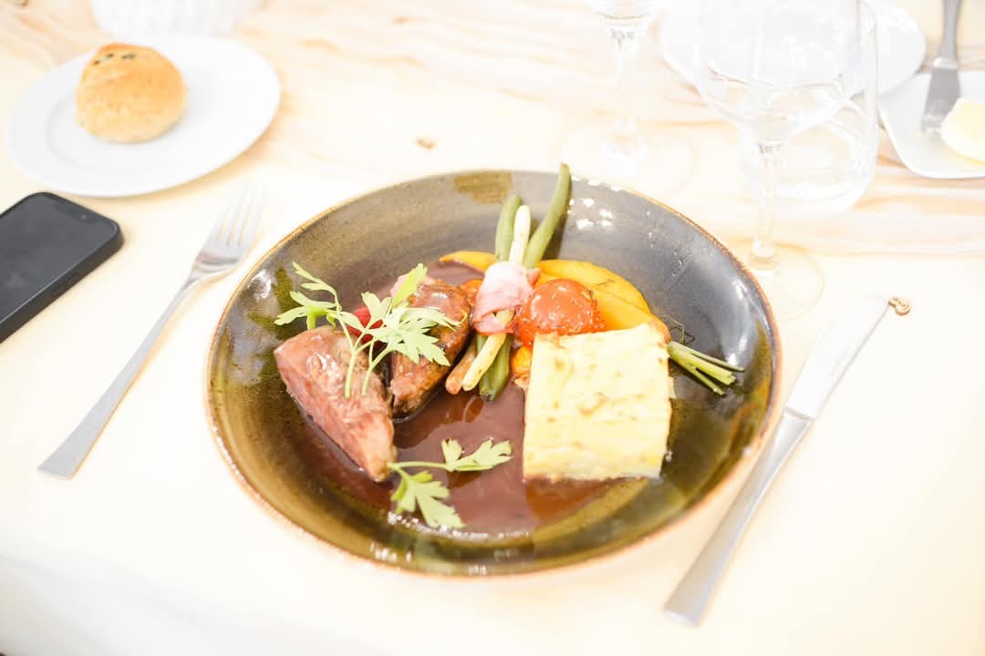 La soirée se prolonge dans l’atmosphère chaleureuse du restaurant de Julie et Sébastien, où un menu en quatre services met à l’honneur les saveurs de la région. Une cuisine généreuse et sensible, qui reflète parfaitement l’esprit du lieu.
