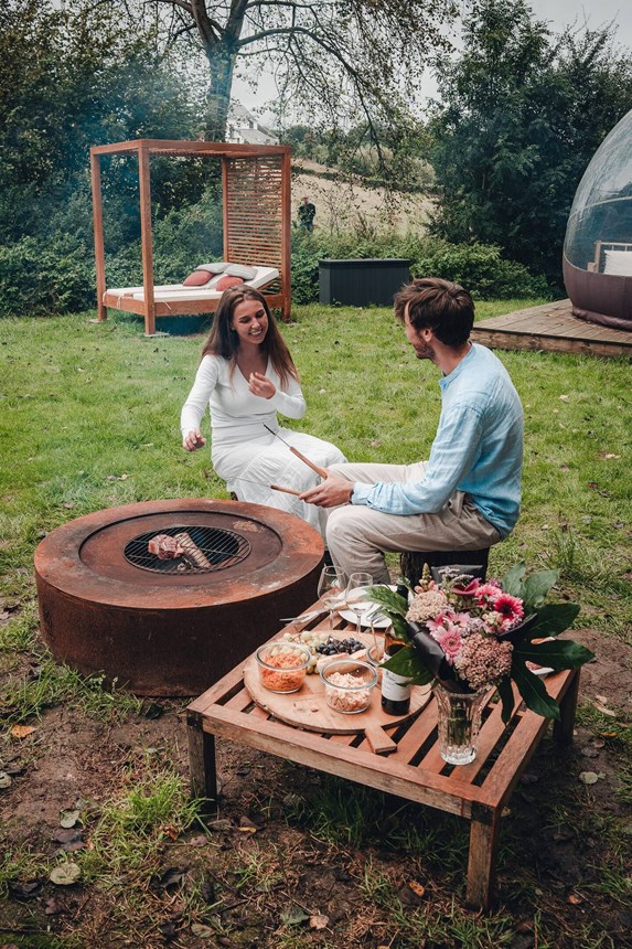 Le soir, votre expérience se poursuit autour d’un repas qui s’adapte aux saisons. Un BBQ lorsque les soirées sont douces, ou une raclette réconfortante lorsque le froid s’installe. Deux manières différentes de savourer un moment chaleureux, dans une atmosphère unique, bercée par le son du ruisseau.